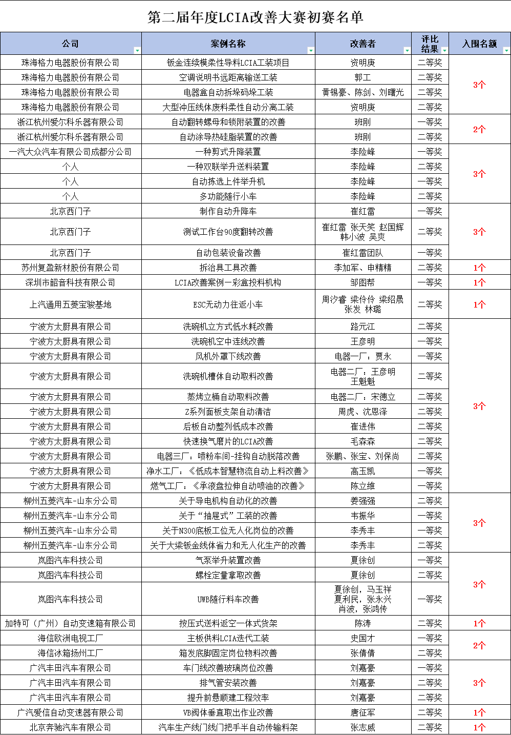 2024第二屆年度LCIA改善大賽自發(fā)布之日起,短短幾個(gè)月即收到了幾百個(gè)案例,感謝各位改善達(dá)人的踴躍參與!經(jīng)過(guò)組委會(huì)初步篩選,最終以上案例脫穎而出!內(nèi)容覆蓋汽車(chē)、新能源、家電、醫(yī)療、塑膠等多個(gè)行業(yè)領(lǐng)域作品。(一家企業(yè)不超過(guò)3個(gè)作品)